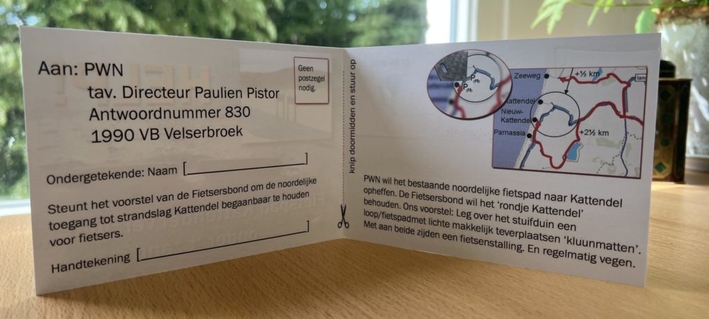 Op zondag 14 mei wordt er bij strandafslag Kattendel een actie georganiseerd. Momenteel loopt er al een actie met briefkaarten; iedereen die het voorstel steunt om de noordelijke toegang tot strandslag Kattendel begaan te houden voor fietsers wordt gevraagd zijn naam en handtekening te zetten op de kant-en-klare ansichtkaart gericht aan PWN directeur Paulien Pistor. De kaarten zijn lokaal verkrijgbaar via de Fietsersbond afdeling Haarlem. Ook is er een petitie tegen de verzanding van fietspaden in Noord-Holland.