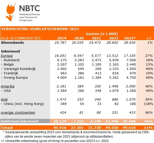 De verwachtingen voor het inkomend toerisme in 2023 zijn in positieve zin bijgesteld. De grootste stijging komt vanuit Duitsland. Dit jaar bezoeken 7 miljoen Duitse gasten Nederland, voor vakantie of zakelijk. Dat is een stijging van 13% t.o.v. 2019. Alleen het Verenigd Koninkrijk blijft nog achter, voornamelijk omdat het nog lang last had van de gevolgen van de in- en uitreisbeperkingen. Dit geldt ook voor landen als China waar de reisbeperkingen pas sinds begin van het jaar opgeheven zijn.