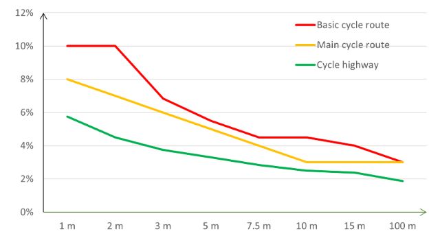 Op basis van de analyse van deze richtlijnen formuleerde de ECF een aantal aanbevelingen. Op een gewone fietsroute is bijvoorbeeld op een hoogteverschil van 2 meter een hellingspercentage van 10 procent acceptabel, op een hoofdfietsroute met een hoogteverschil van 5 meter is dat 5 procent en op een fietssnelweg met een hoogteverschil van 100 meter 2 procent.