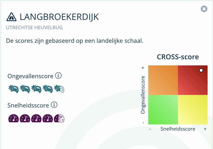 CROSS -een samenwerking van de politie, Verbond van Verzekeraars en VIA- registreert de officiële ongevallen en snelheidsdata en maakt deze beschikbaar via www.bliq.report. De CROSS-score van de Langbroekerdijk geeft de verkeersveiligheid in onderstaand diagram weer, deze is zeer zorgelijk. Zo vonden er in 2023 op de dijk 6 ongelukken plaats met letsel plaats waar een ambulance aan te pas moest komen.