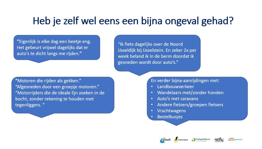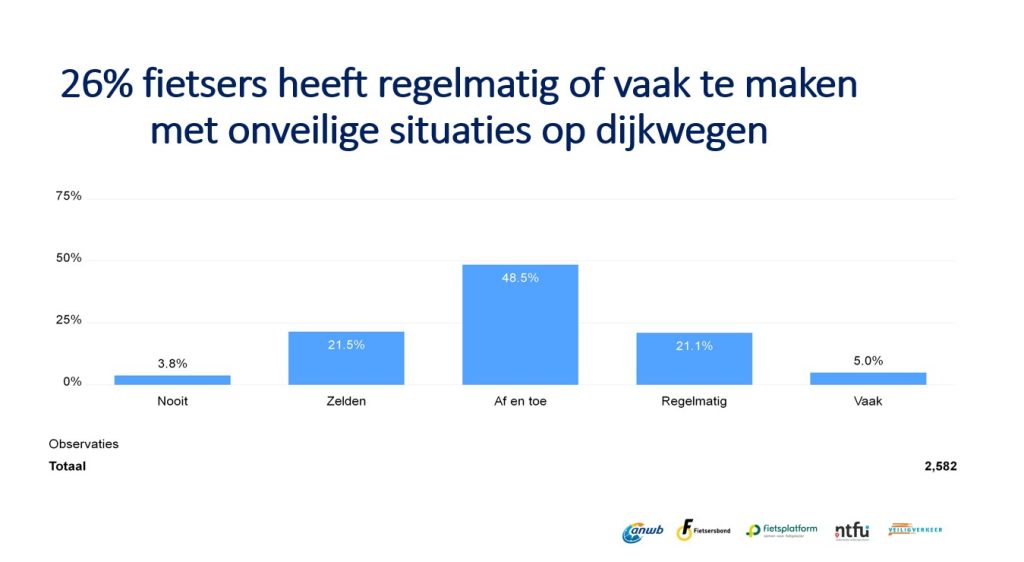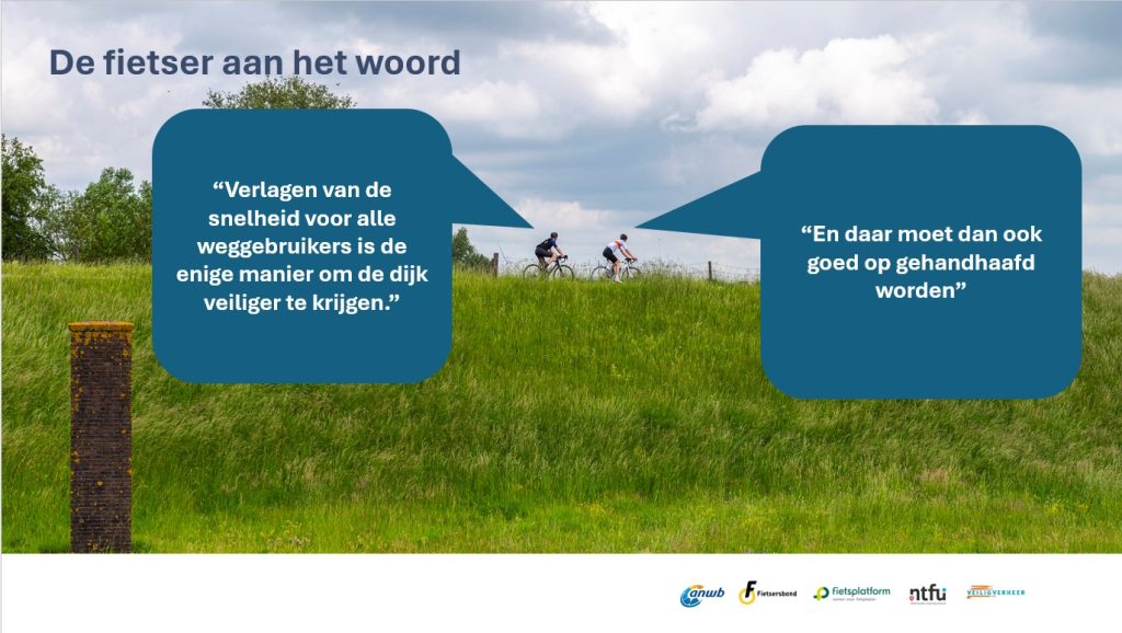 De resultaten zijn zorgwekkend: een kwart van de fietsers heeft regelmatig of vaak te maken met onveilige situaties op dijkwegen, terwijl bijna de helft dit soort situaties af en toe meemaakt. Aan bod kwam ook het mijden van dijkwegen vanwege het gevoel van onveiligheid, hoe onveilige situaties op dijkwegen ontstaan en hoe de veiligheid op dijkwegen verbeterd kan worden.