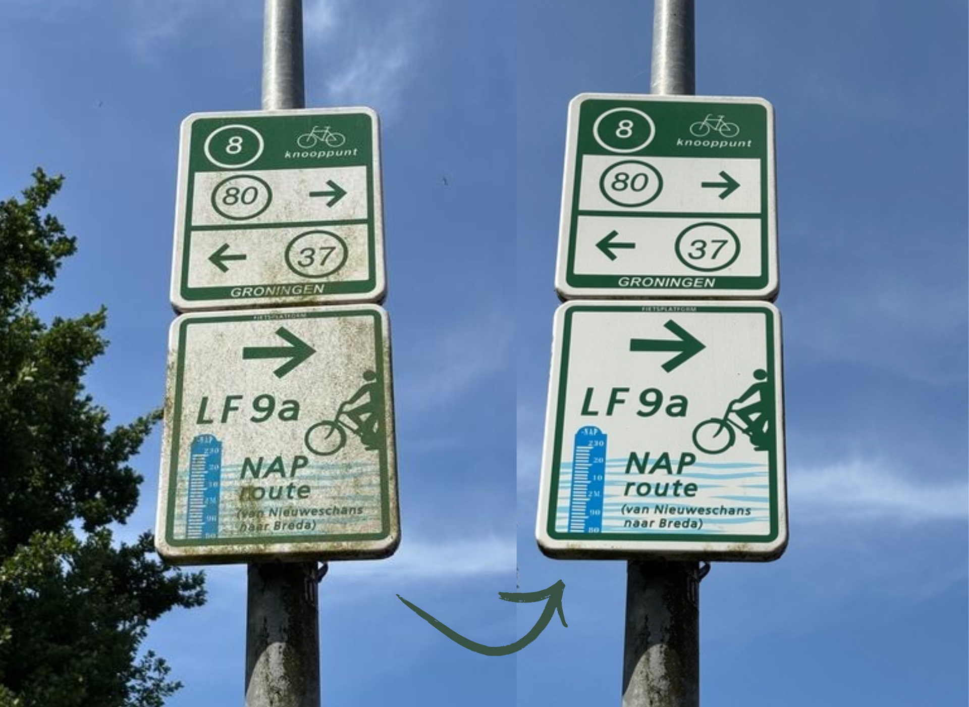 ‘Vooral veel meldingen van ontbrekende bordjes, die in de meeste gevallen razendsnel zijn opgepakt door de regionale routebureaus. Vrijwilligers hebben zelf ook bevuilde bordjes schoongemaakt en overhangend groen weggehaald. Dankzij de schouw kwamen we er bijvoorbeeld achter dat een pontje gewijzigde vaartijden had en dat er een omleiding was waar we nog niet van wisten. Het levert dus veel nuttige informatie op.’