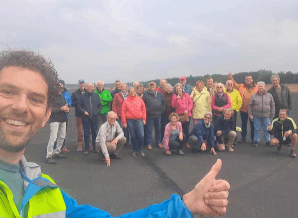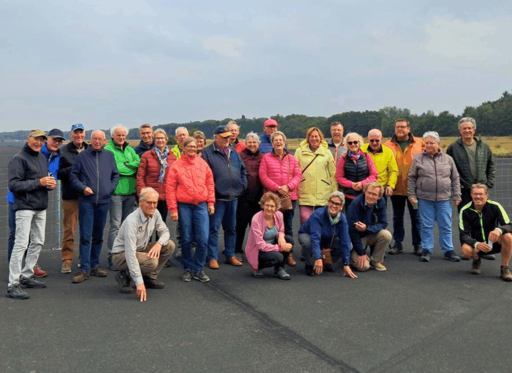 Na een lekkere en gezellige lunch vertrokken we voor de fietstocht. Het weer werkte mee: hoewel het fris was, bleef het droog. Halverwege kwam de groep samen voor een foto op de landingsbaan bij Soesterberg en een hapje en drankje.