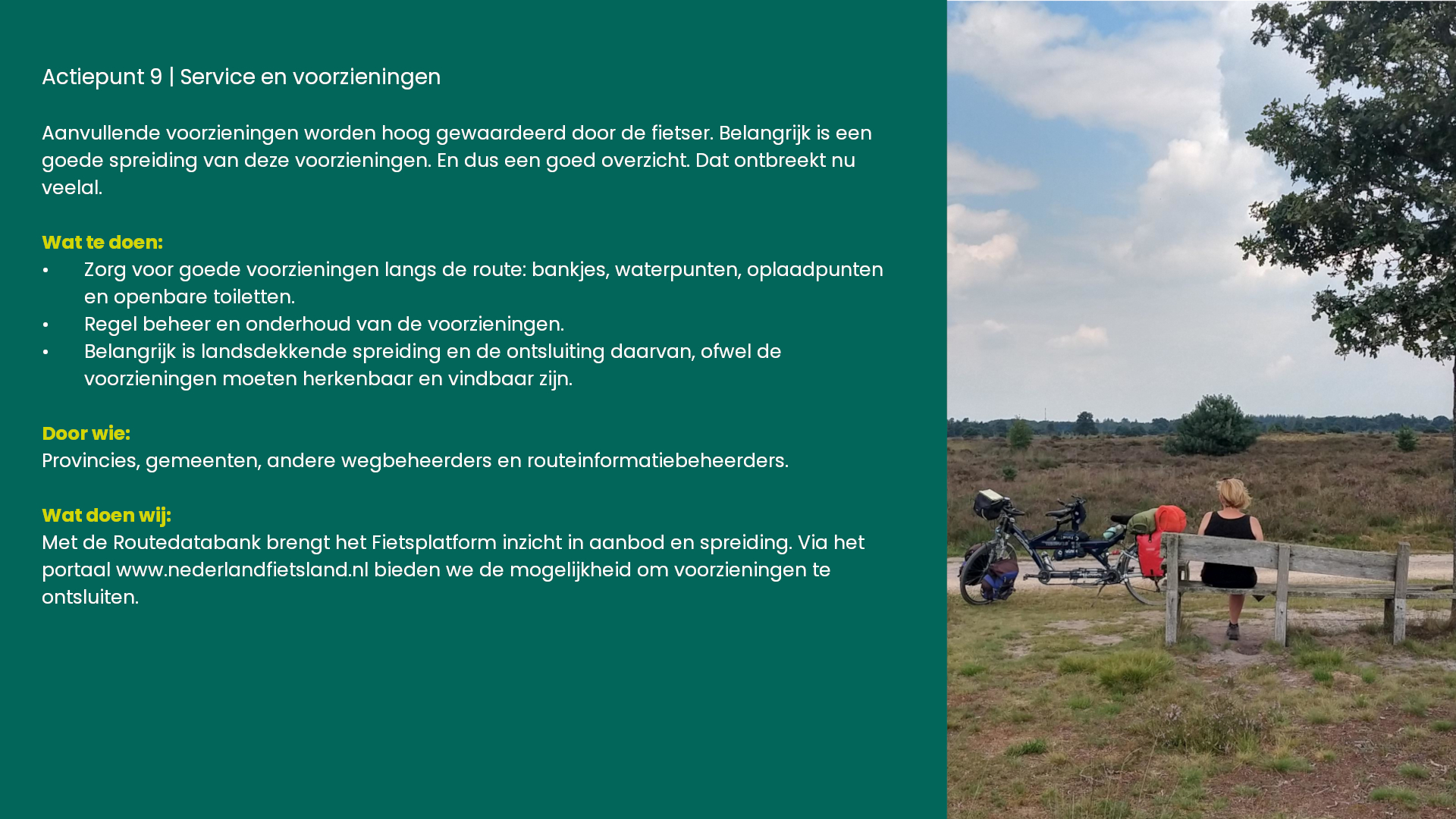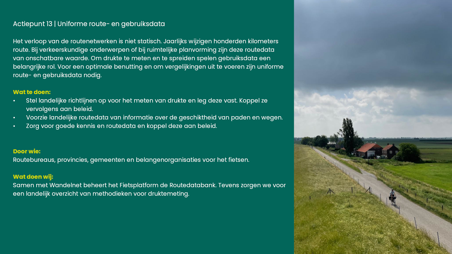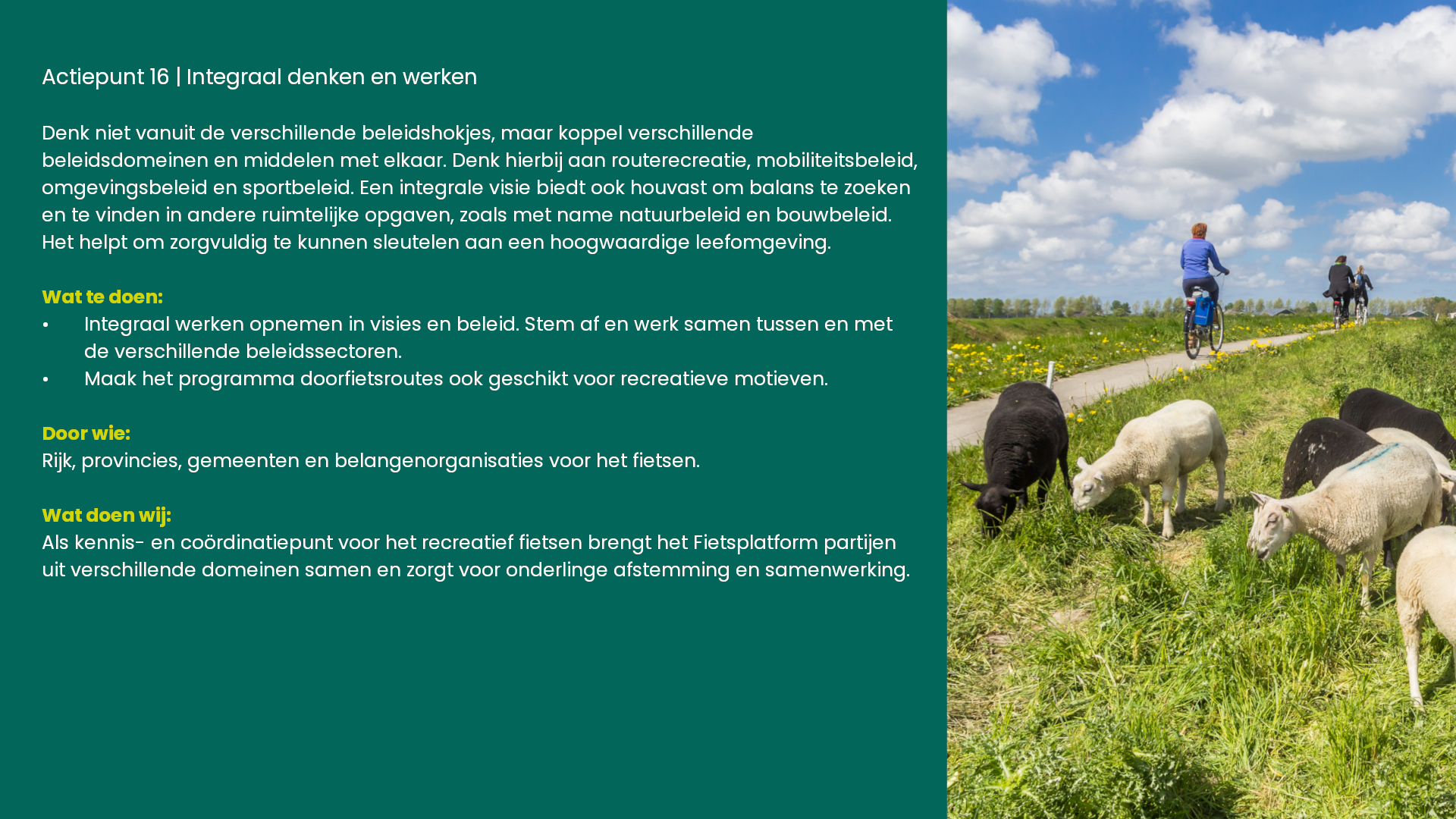 In het perspectief ‘Het recreatieve fietslandschap in 2030’ geven we een inkijk in hoe de toekomst van het beste recreatieve fietsland van de wereld er volgens ons uitziet, wat de kansen zijn en de bedreigingen. Voor welke opgaven we staan en wat er moet gebeuren.