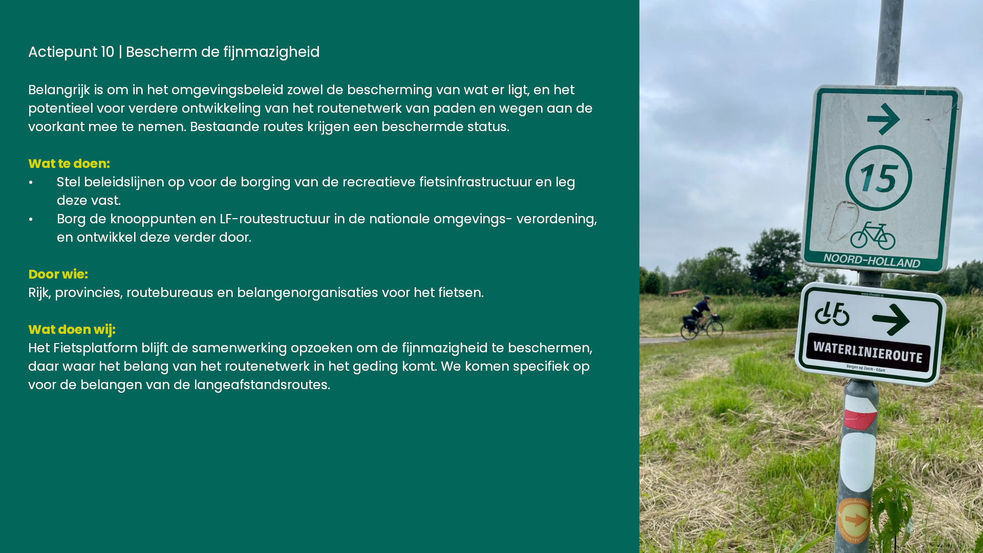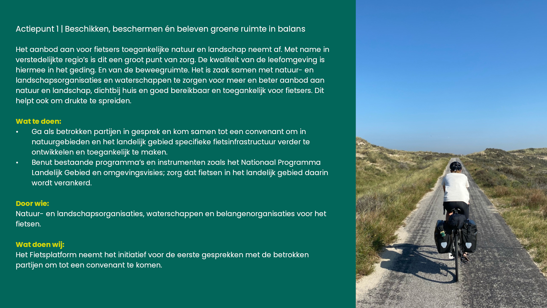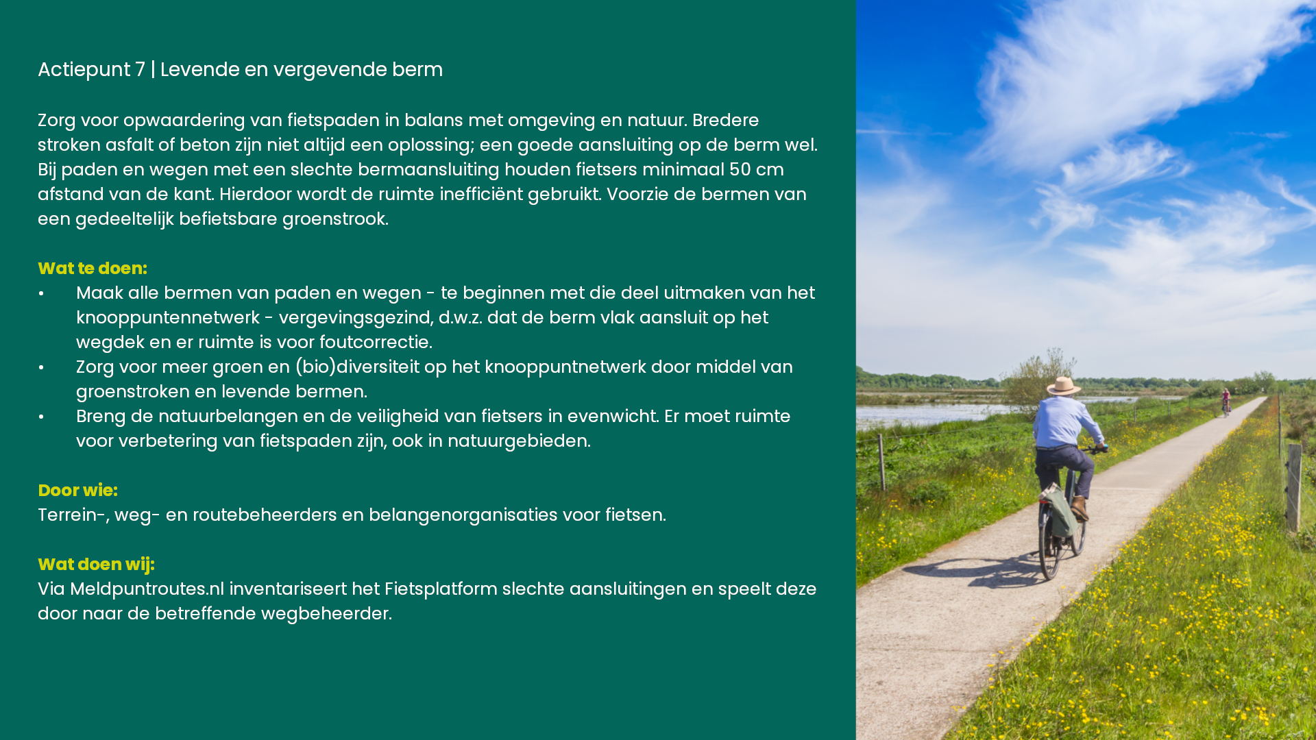 In het perspectief ‘Het recreatieve fietslandschap in 2030’ geven we een inkijk in hoe de toekomst van het beste recreatieve fietsland van de wereld er volgens ons uitziet, wat de kansen zijn en de bedreigingen. Voor welke opgaven we staan en wat er moet gebeuren.
