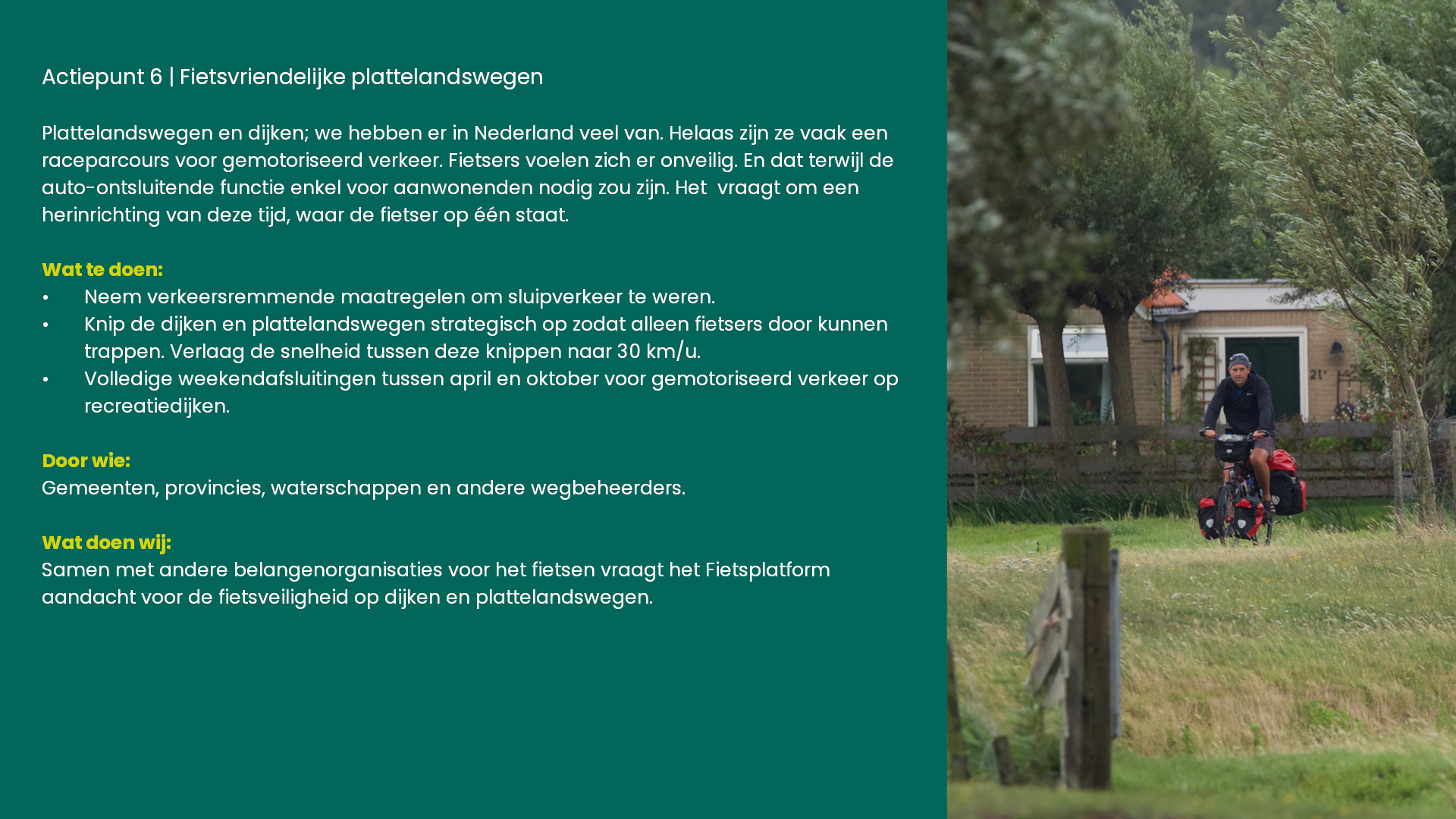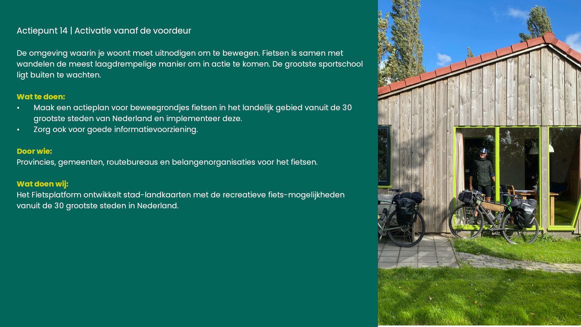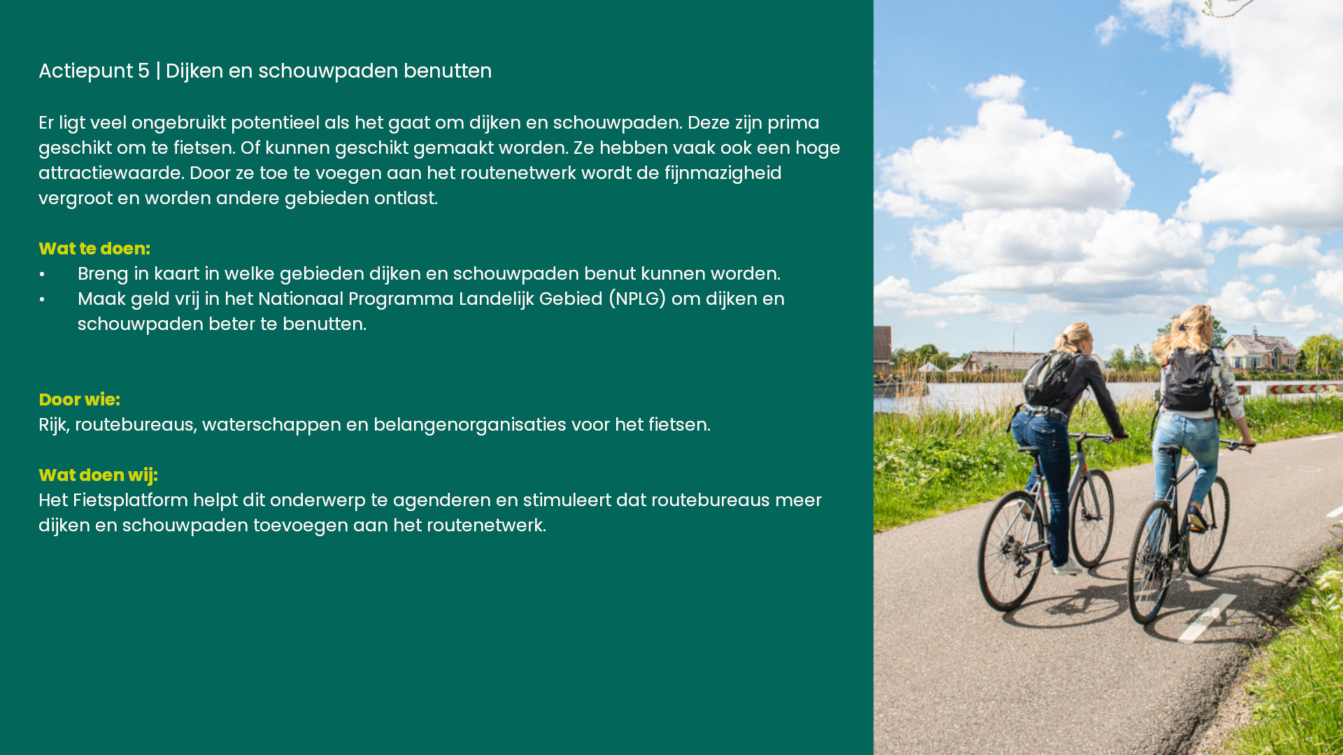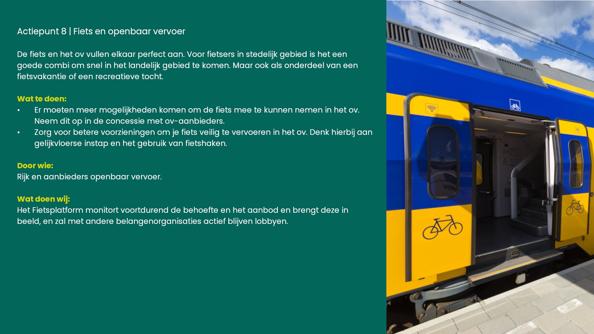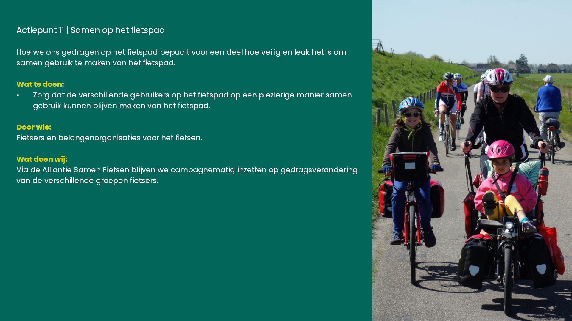 Samen gaan we aan de slag om uitvoering te geven aan de actieagenda. Het Fietsplatform fungeert als aanjager en bewaker.